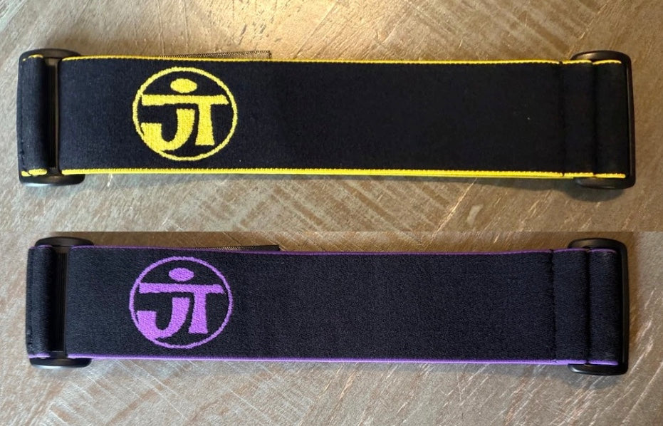 Classic purple and black and Classic black and yellow JT Goggle Strap. Fits the JT Proflex, Flex 8, Proflex X, Proshield, Proteus and other JT goggles. Silicone on back.